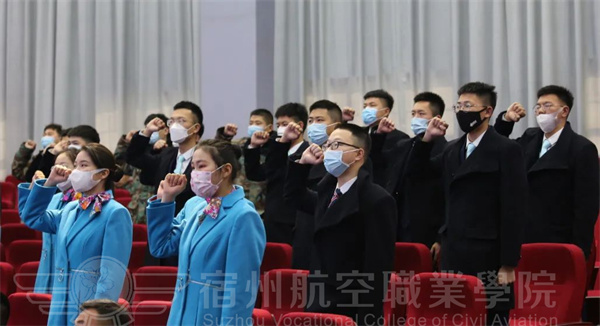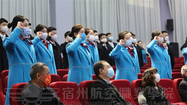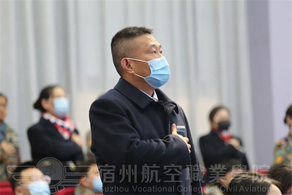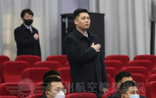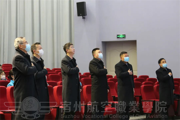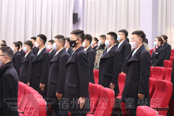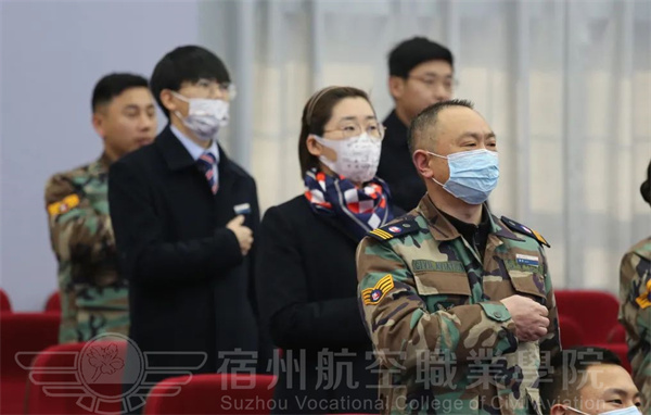 宿航院校学子全体肃立,注视国旗高唱国歌。