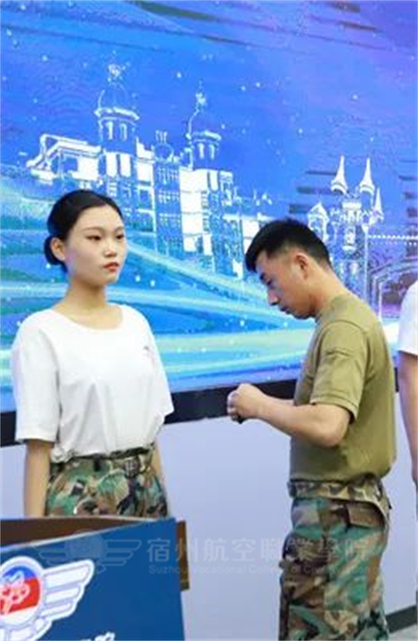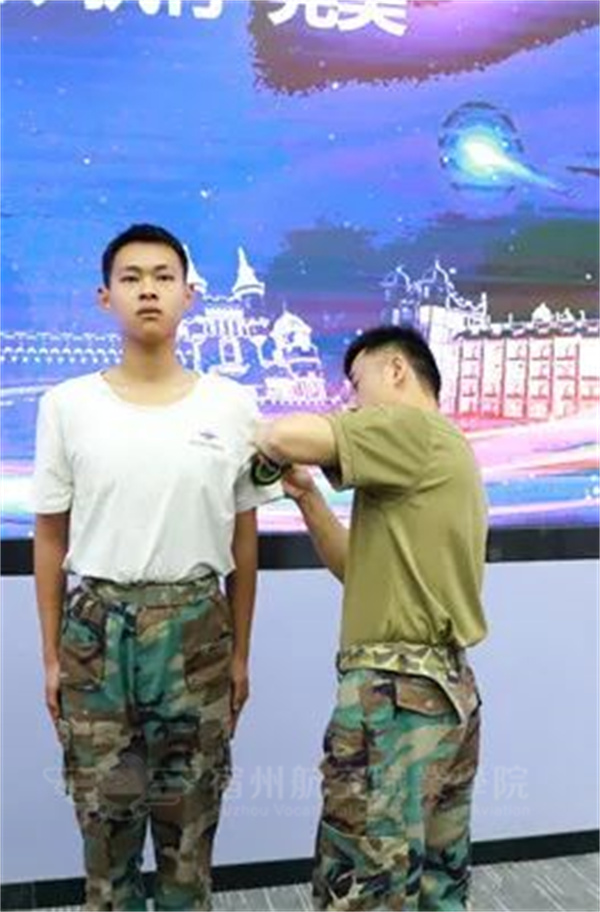 宿航院军体教官关振东任命王旭🤾🏻、孙密密🌘、赵家福3名同学担任此次活动实习教官并授予臂章。