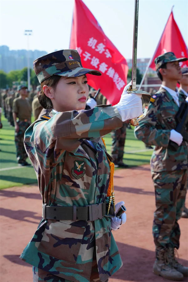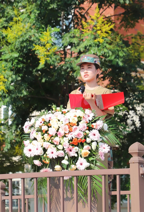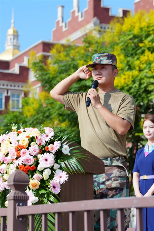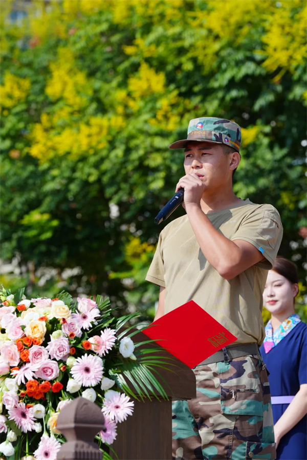 24级空乘2班新生王柄骅代表全体新生郑重宣誓🍆:一、以军人的标准严格要求自己。二、不怕吃苦,团结一心。三、尊重教官,虚心学习。表示会以优异的成绩完成训练任务🏃♀️。