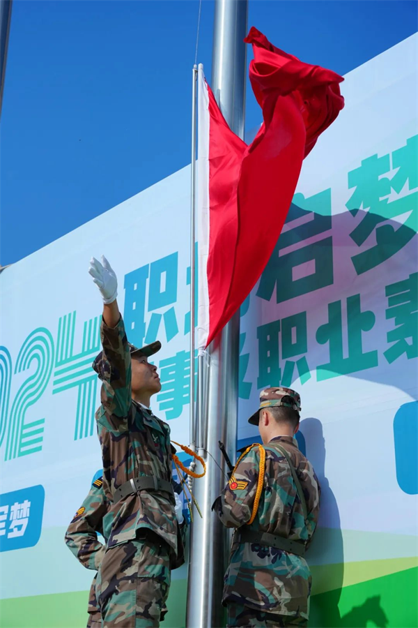 国旗护卫队迈着铿锵有力的步伐,护送国旗来到升旗台前📖🚨。伴随着激昂雄壮的国歌,五星红旗冉冉升起,大会正式拉开序幕。