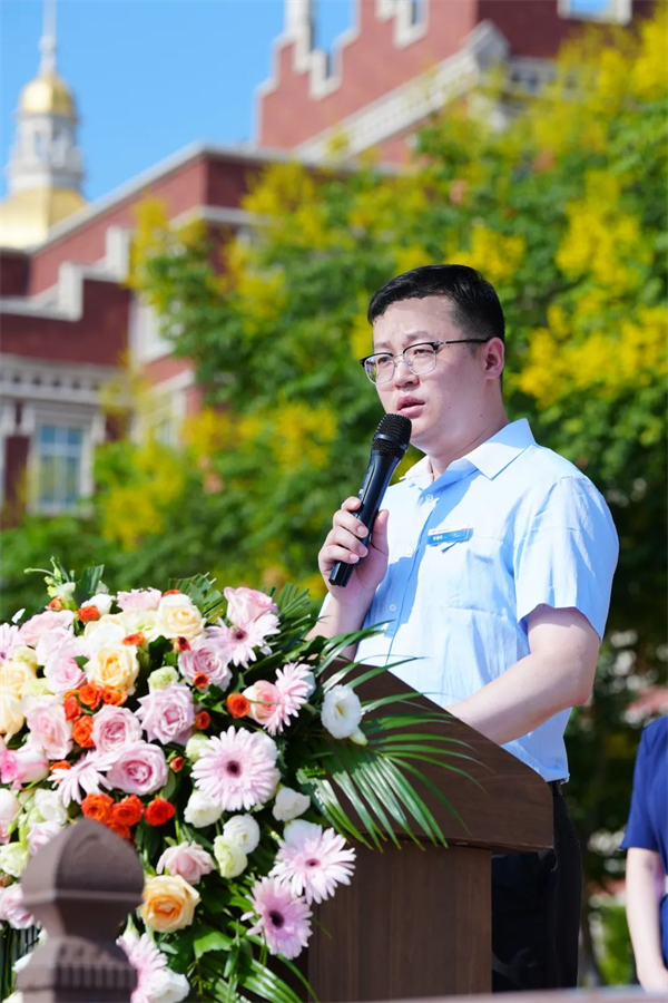 盛梓强带领同学们宣誓:坚持传承善与美德,传递爱与快乐的院校精神,牢记完善自我🧈,创造生活的校训👰🏽♂️,让我们成为现代绅士与淑女。