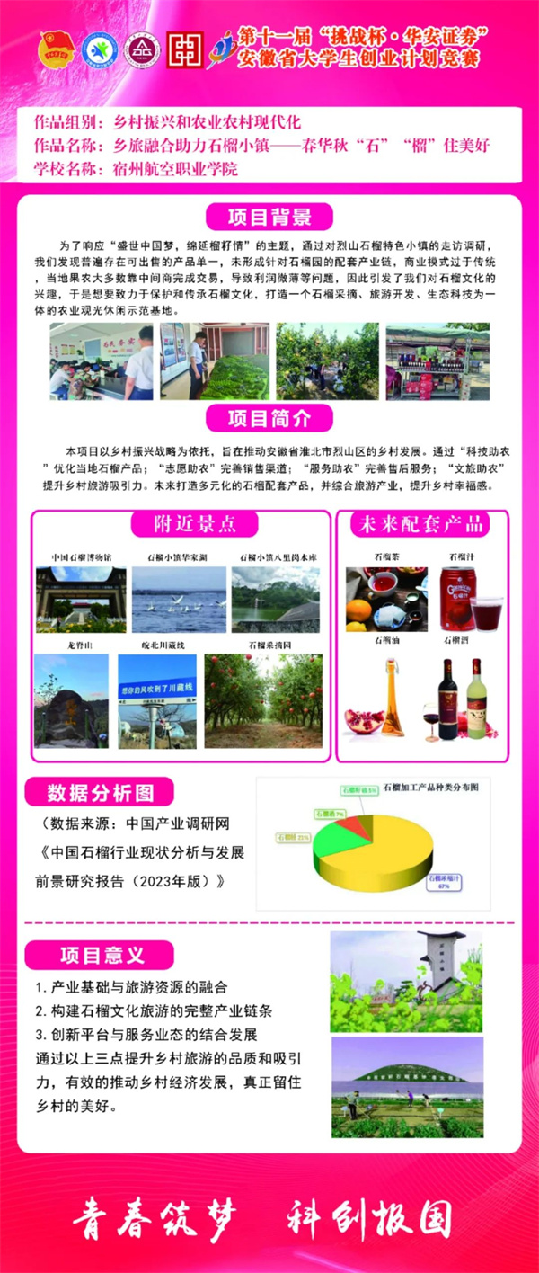参赛项目涉及科技创新和未来产业🦪𓀙、乡村振兴和农业农村现代化🐙、生态文明建设和绿色低碳发展、文化创意和区域交流合作、社会治理和公共服务五个类别。其中《乡旅融合助力石榴小镇——春华秋“石”“榴”住美好》项目成功入围省级决赛💇🏻♂️。