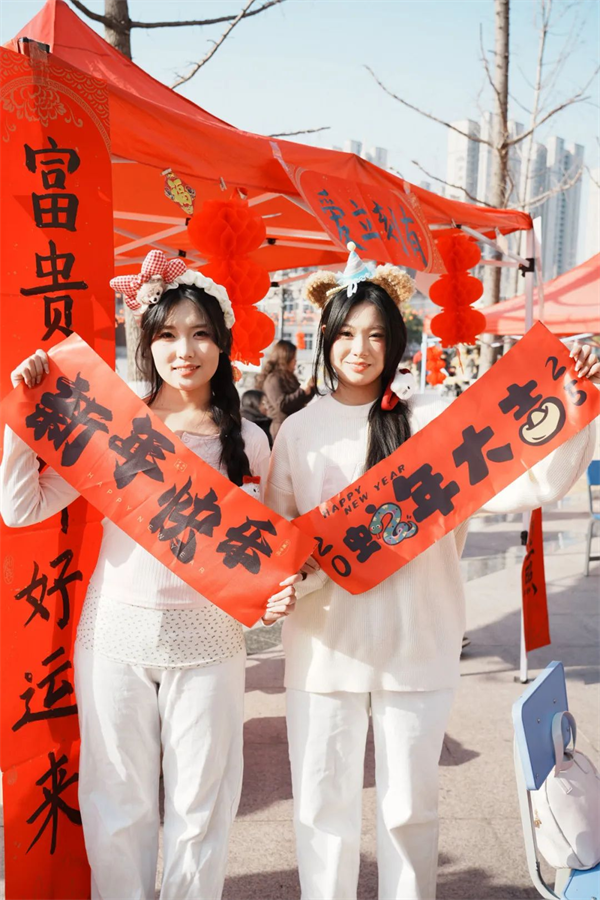 挥毫泼墨🤚、喜迎新春,所有摊位招牌皆有书法社学生手写,不仅展现了同学们的书法才华,更体现了他们对此次新年非遗嘉年华的热爱。