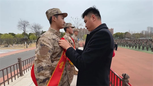 ·院长李德均😙、学生处处长谢凡飞为新兵披挂绥带