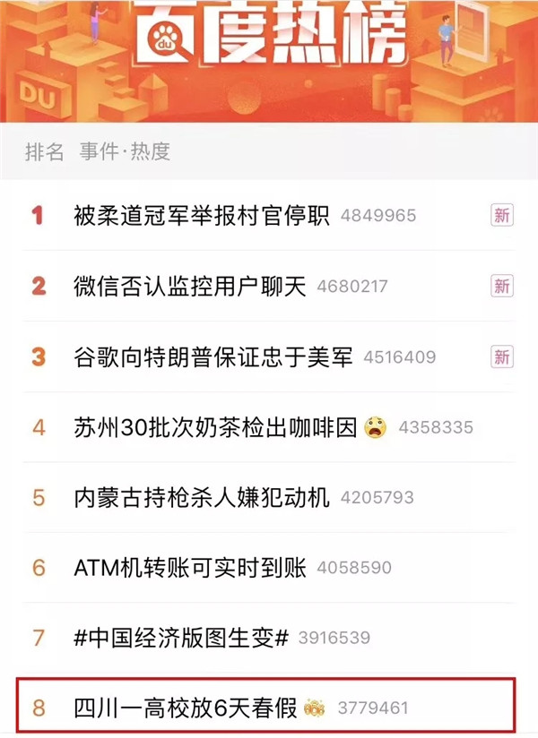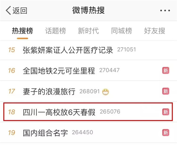 32815:31  话题“四川一高校放6天春假”以第18的排名登上微博热搜榜