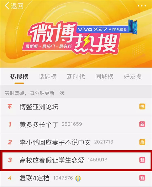 32819:00  话题“高校放春假让学生恋爱”以第3的排名登上微博热搜榜🍽。