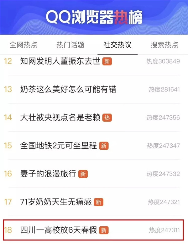 除了微博热搜榜🤾🏼‍♀️,“四川一高校放6天春假”的话题还登上了其他多个新闻客户端的头条推送、热搜版……