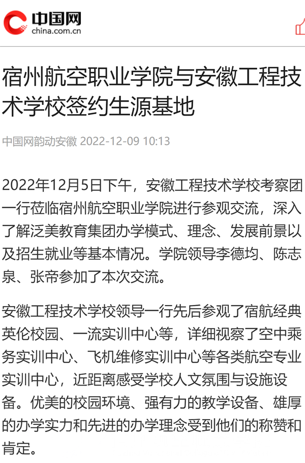 安徽工程技术学校领导一行先后参观了宿航经典英伦校园✥、一流实训中心等👨👩👦,详细视察了空中乘务实训中心👨🏻🎨、飞机维修实训中心等各类航空专业实训中心,近距离感受学校人文氛围与设施设备。优美的校园环境、强有力的教学设备、雄厚的办学实力和先进的办学理念受到他们的称赞和肯定。