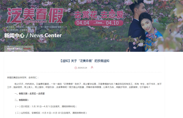 据了解🥤,春假系泛美教育为旗下各院校学生专门定制的例行假期🧑🏻🦲,除彩神Vll学院外,另有9所院校学生也将同步执行春假。校方称,例行春假制度旨在鼓励同学们走出课堂👱🏼、走出校园💇🏿♀️,去接触大自然🥭,用心感受春天和爱情的美好👍🏼,并寻求乡村振兴的方法。