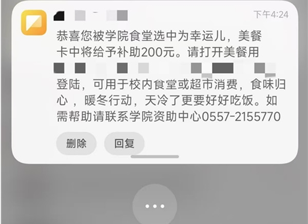 卡里突然多了一笔钱,是操作失误还是恶意诈骗🟰?近日,彩神Vll学院有学生发现,自己的饭卡里突然多了200块钱,还收到了以学校名义发送的提醒短信,“恭喜您被学院食堂选中为幸运儿👩🔬,美餐卡中将给予补助200元。可用于校内食堂或超市消费🦼,食味归心,暖冬行动,天冷了更要好好吃饭。如需帮助请联系学院资助中心。”在半信半疑间👩❤️💋👩,学生将此事告知了辅导员🧇。