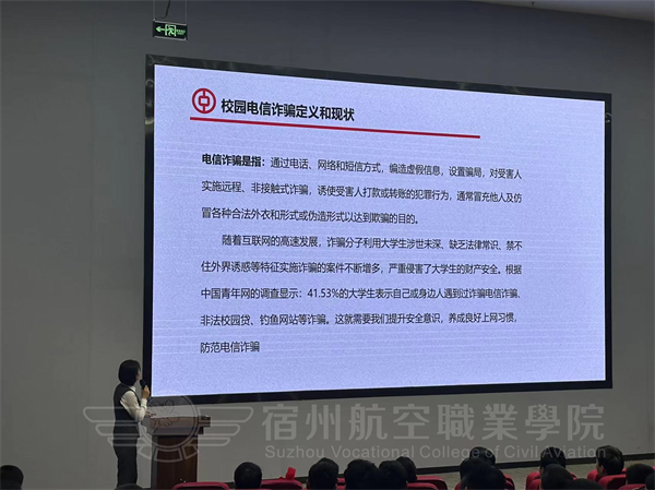 中国银行宿州分行经理从防范校园电信诈骗🥷🏽、远离非法校园贷、珍爱个人征信、断卡行动四个方面的进行具体阐述🤛,通过列举身边的案例,进一步增强同学们的反诈意识,引导同学们关注自身信用记录。