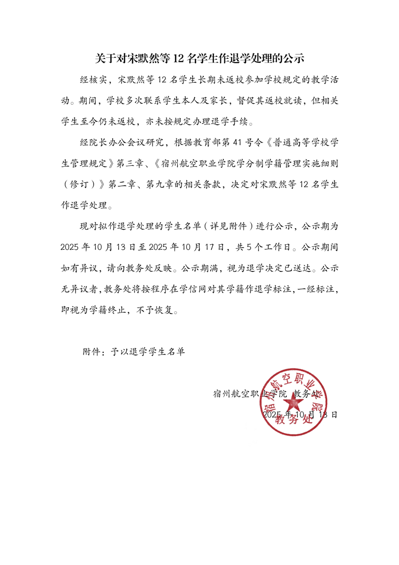 关于对宋默然等12名学生作退学处理的公示