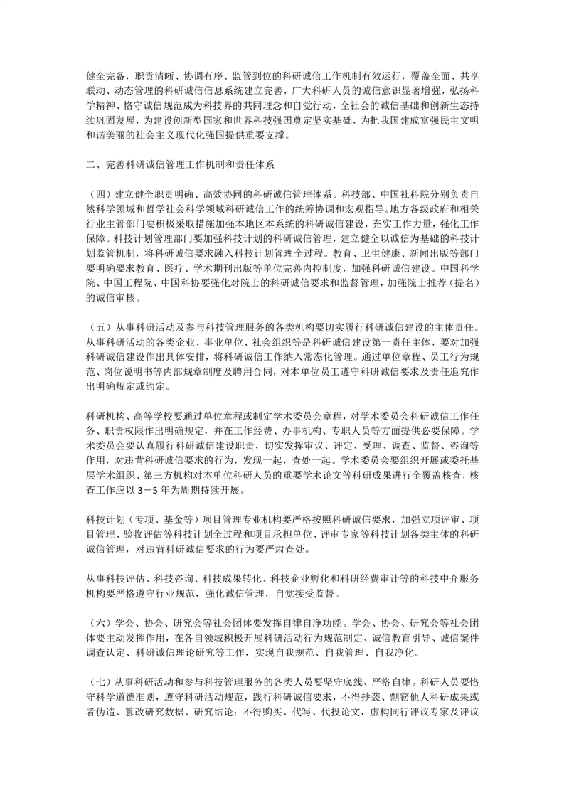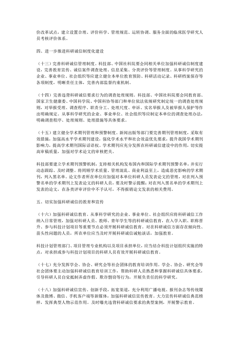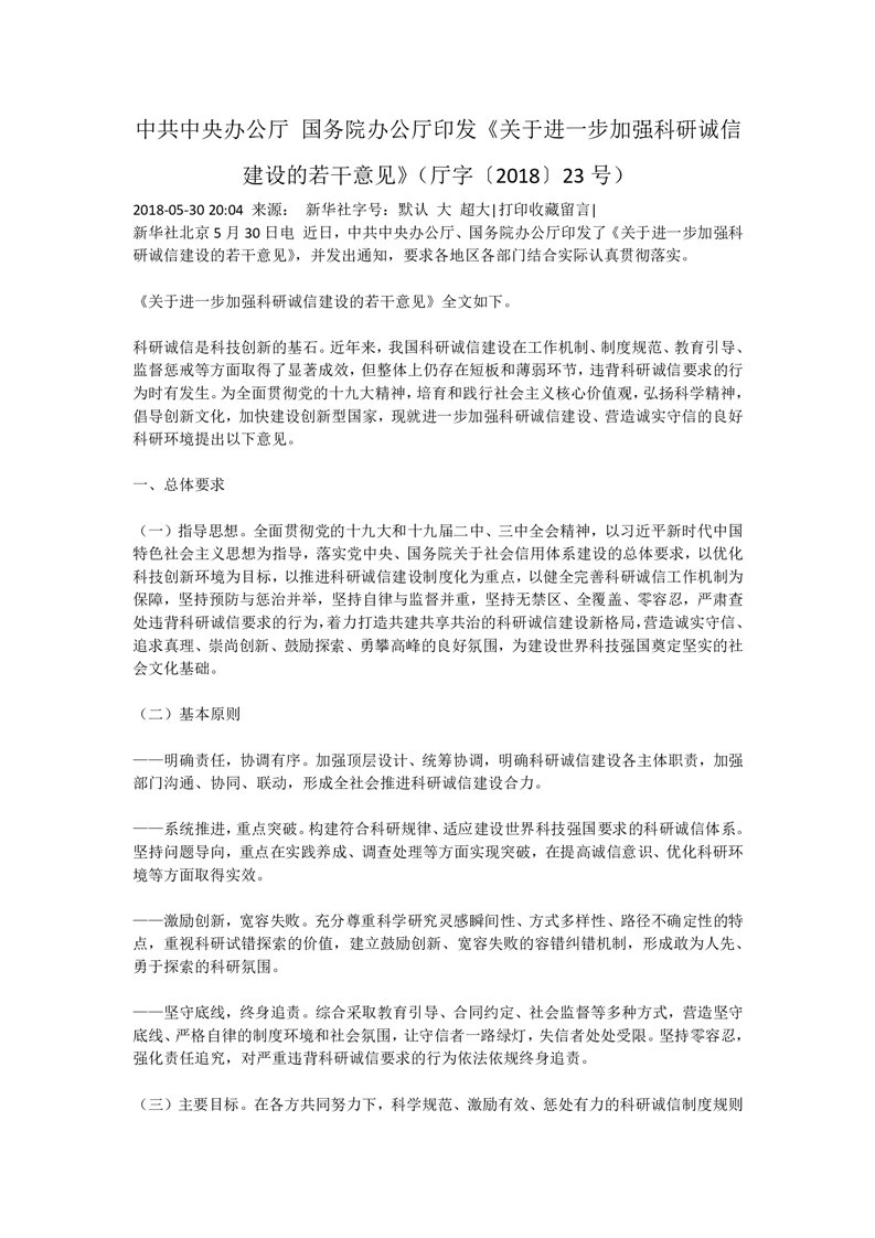 中共中央办公厅 国务院办公厅印发《关于进一步加强科研诚信建设的若干意见》(厅字〔2018〕23 号)