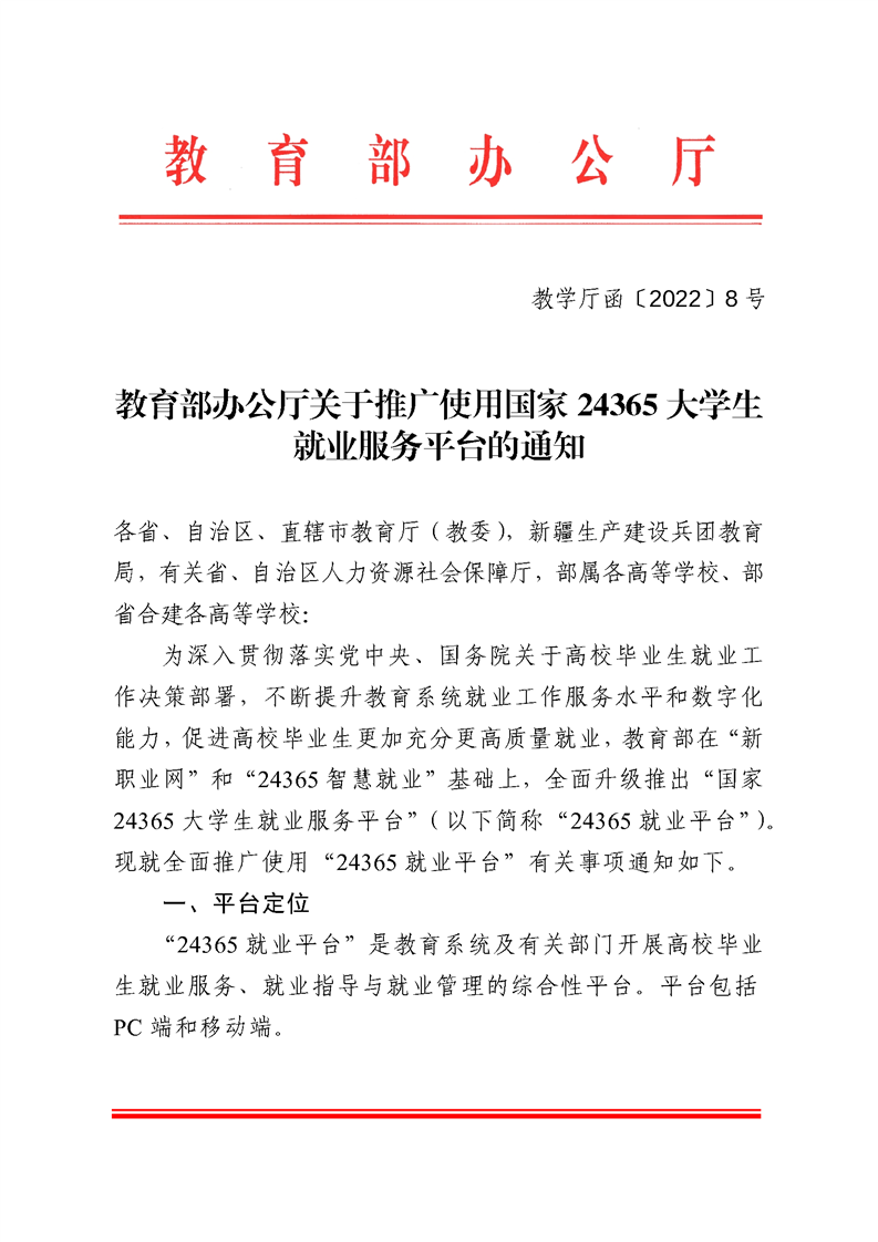 教育部办公厅关于推广使用国家24365大学生就业服务平台的通知