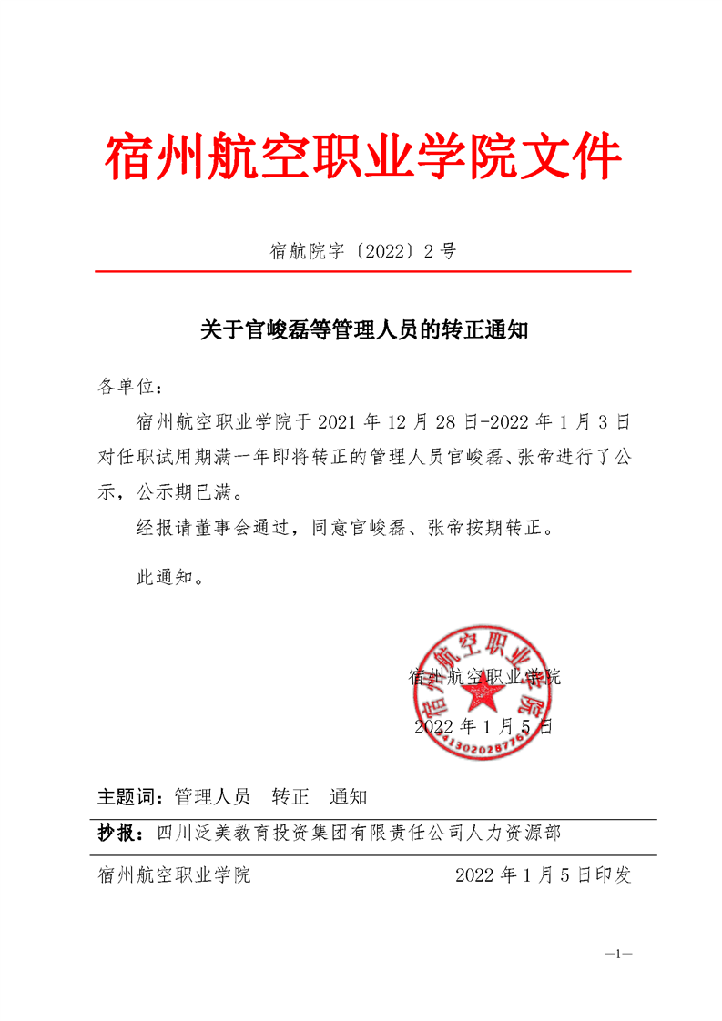 关于官峻磊等管理人员转正的通知