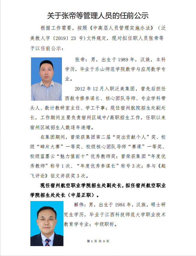 关于张帝等管理人员的任前公示