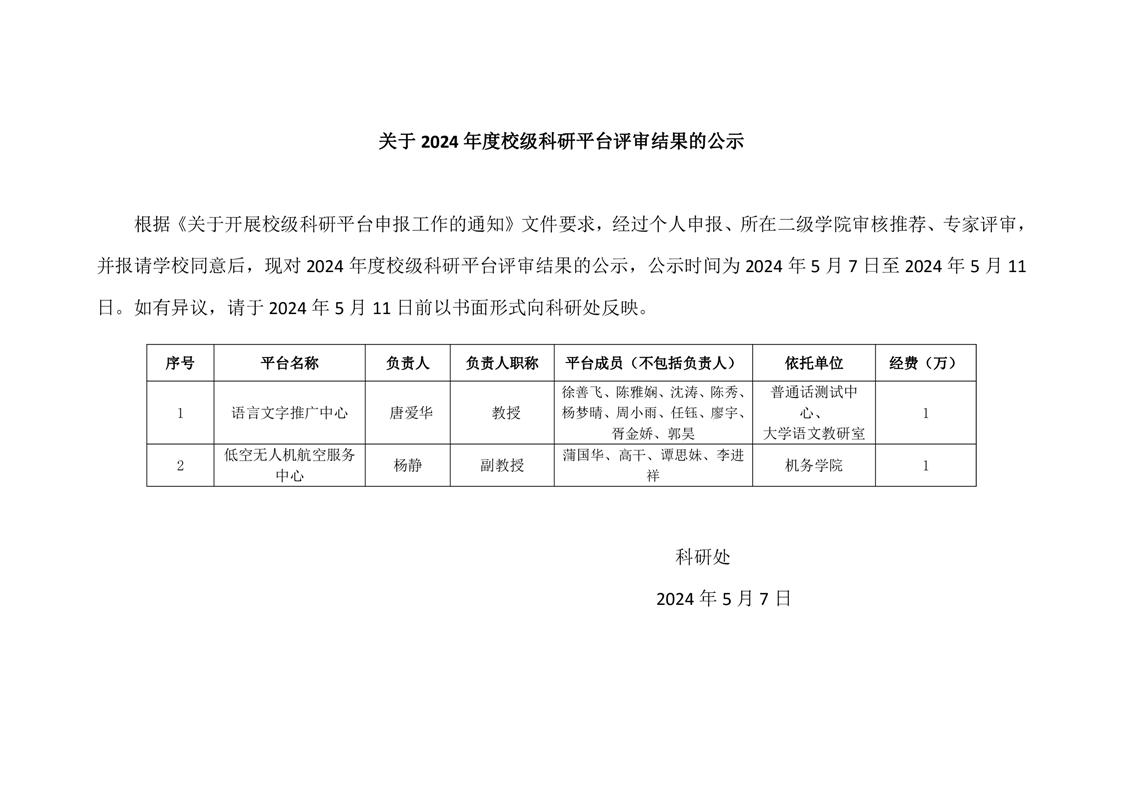 关于2024年度校级科研平台评审结果的公示