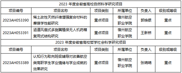 近日🫗,安徽省教育厅下发《安徽省教育厅关于审核同意有关高校2023年度科研计划的通知》(皖教秘科〔20236号)🏊🏻‍♂️,我院《稀土改性天然纤维增强复合材料的摩擦学性能研究》和《涵道风扇式多旋翼植保无人机药箱复用式结构研究》2个自然科学研究项目和《认知行为取向班级辅导对改善航空类高职学生学业情绪与学业成就的效果研究》1个哲学社会科学研究项目喜获立项,项目级别为重点项目,建设周期为2年。