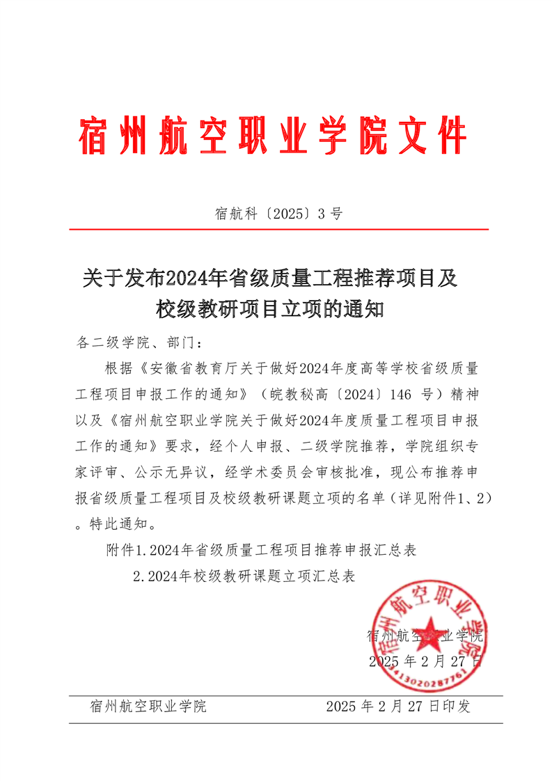 关于发布2024年省级质量工程推荐项目及校级教研项目立项的通知