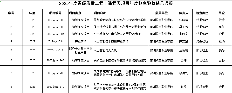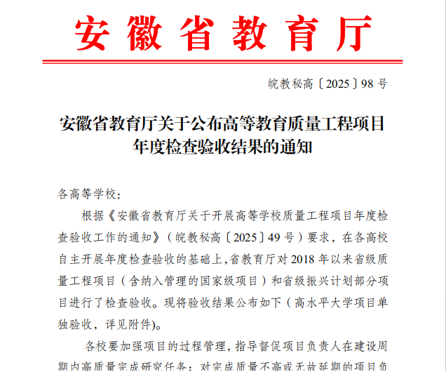 根据《安徽省教育厅关于开展高等学校质量工程项目年度检查验收工作的通知》(皖教秘高〔202549号)要求,省教育厅开展了2024年度省级质量工程项目检查验收工作🧏🏿‍♀️❇️。在我院检查验收评审后,省教育厅组织专家对课程类项目和非课程类项目进行了审核,现将有关结果予以通报,我4项省级质量工程项目顺利结项,其中一项优秀、两项良好🛅🐣、一项合格🤥;另有1项质量工程项目撤项,1项延期🕵🏻‍♀️。其他5项省级质量工程项目的阶段检查均已合格,希望阶段检查项目合格的主持人,尽快开展项目研究👎🏼,确保顺利结项👨🏽🦹🏽‍♀️。