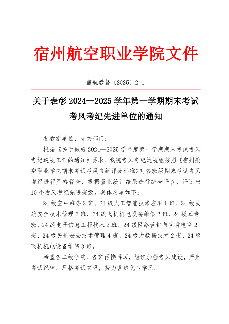 关于表彰2024—2025学年第一学期期末考试先进班级的通知