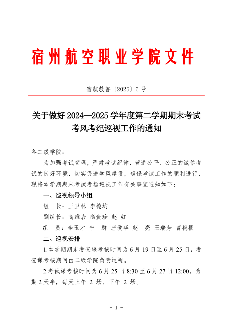 关于做好2024—2025学年度第二学期期末考试考风考纪巡视工作的通知