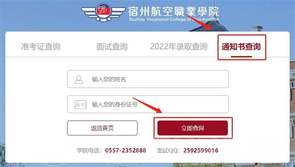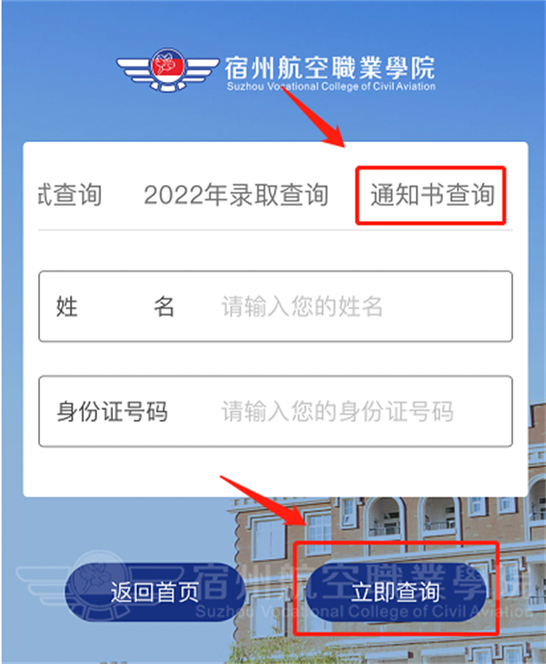 2.进入后,点击“通知书查询”,根据提示填写学生姓名及身份证号码🔂,填写正确后,点击“立即查询”,即可查看录取通知书邮寄单号;