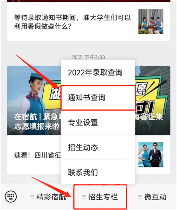 2.进入公众号后点击“招生专栏”,点击上方“通知书查询”🧑🏼‍🌾;