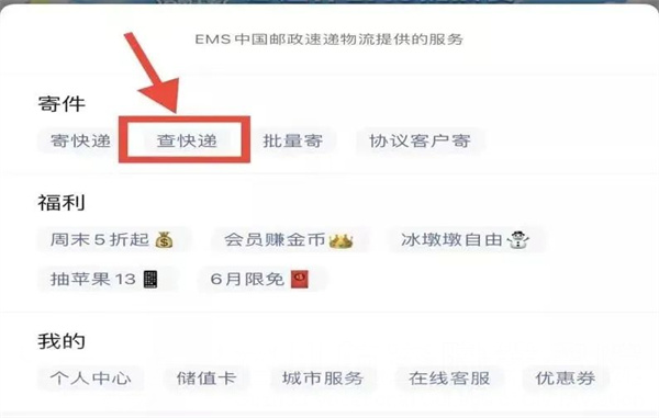 2.点击标题栏“服务”后👩🏻‍🦽‍➡️,点击“查快递”♏️,进入物流状态查询界面,