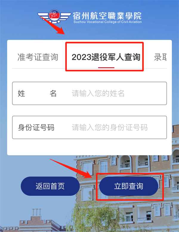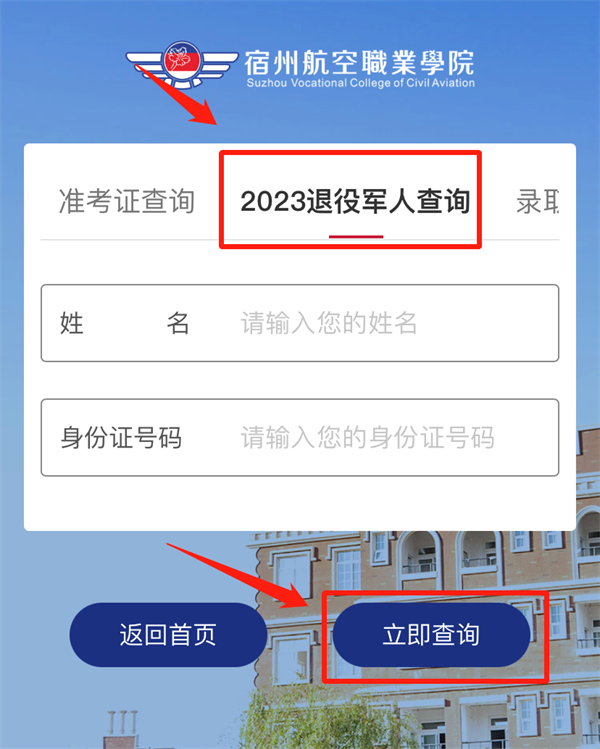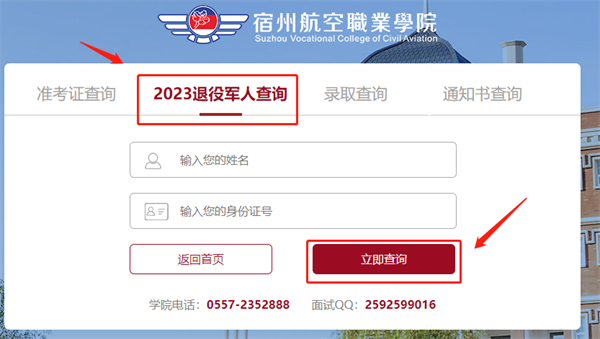2.进入后,点击“2023退役军人查询”,根据提示填写学生姓名及身份证号码,填写正确后,点击“立即查询”,即可查看资格审核结果🧙🏽♀️;