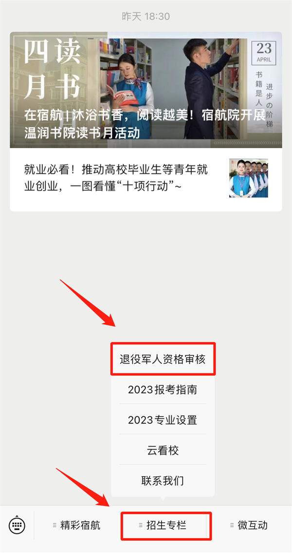 2.进入公众号后点击“招生专栏”🫵,点击上方“退役军人资格审核”;