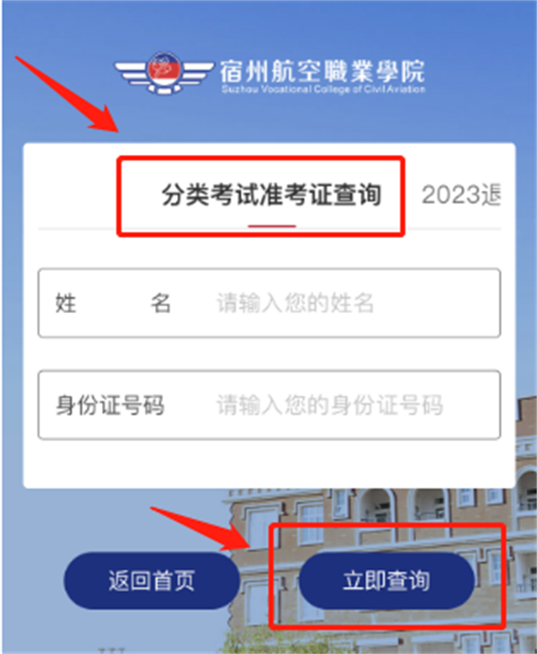 2.进入后点击“分类考试准考证查询”🧙🏽♂️🈁,根据提示填写“姓名”及“身份证号码”,填写正确后🙇🏽♀️,点击下方“立即查询”🧖🏽,即可查看准考证;