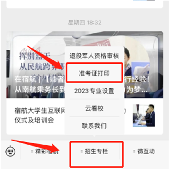2.进入公众号后点击下方“招生专栏”,之后点击上方“准考证打印”⚡️,进入准考证查询页面;