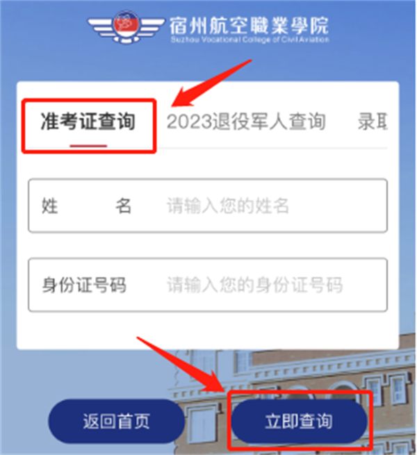 3.进入后点击“准考证查询”,根据提示填写“姓名”及“身份证号码”,核实无误后💆🏻♂️,点击下方“立即查询”,即可查看准考证📌;