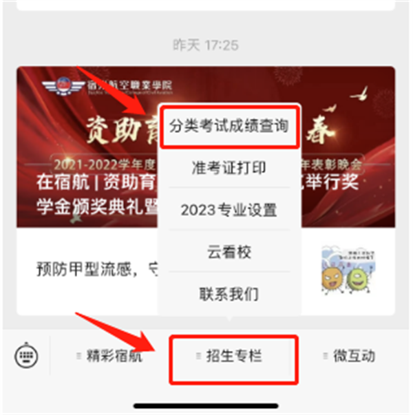 2.进入公众号后点击下方“招生专栏”,之后点击上方“分类考试成绩查询”,进入查询页面;