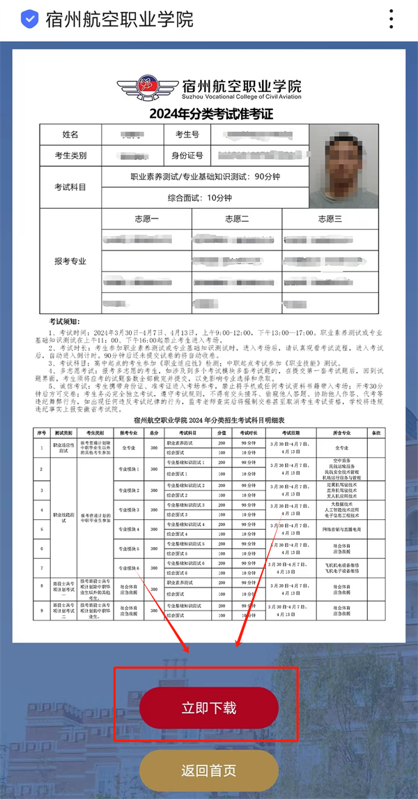 3.点击立即查询后,即可查看准考证信息,请考生仔细核对个人信息𓀃👨🏻‍🦯‍➡️,核对无误后🛩,点击下方立即下载,下载准考证。