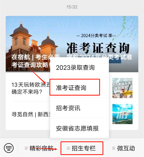 2.进入公众号后点击下方招生专栏,之后点击上方准考证查询,进入查询页面;