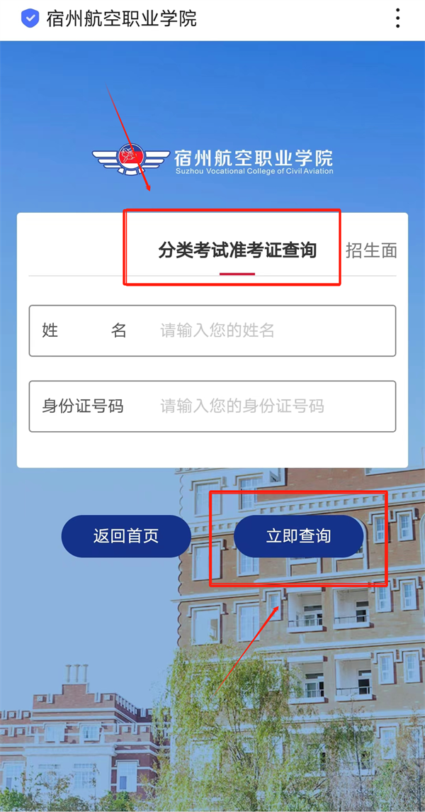 2.进入后点击分类考试准考证查询,根据提示填写学生姓名及身份证号码,填写正确后🍖,点击下方立即查询
