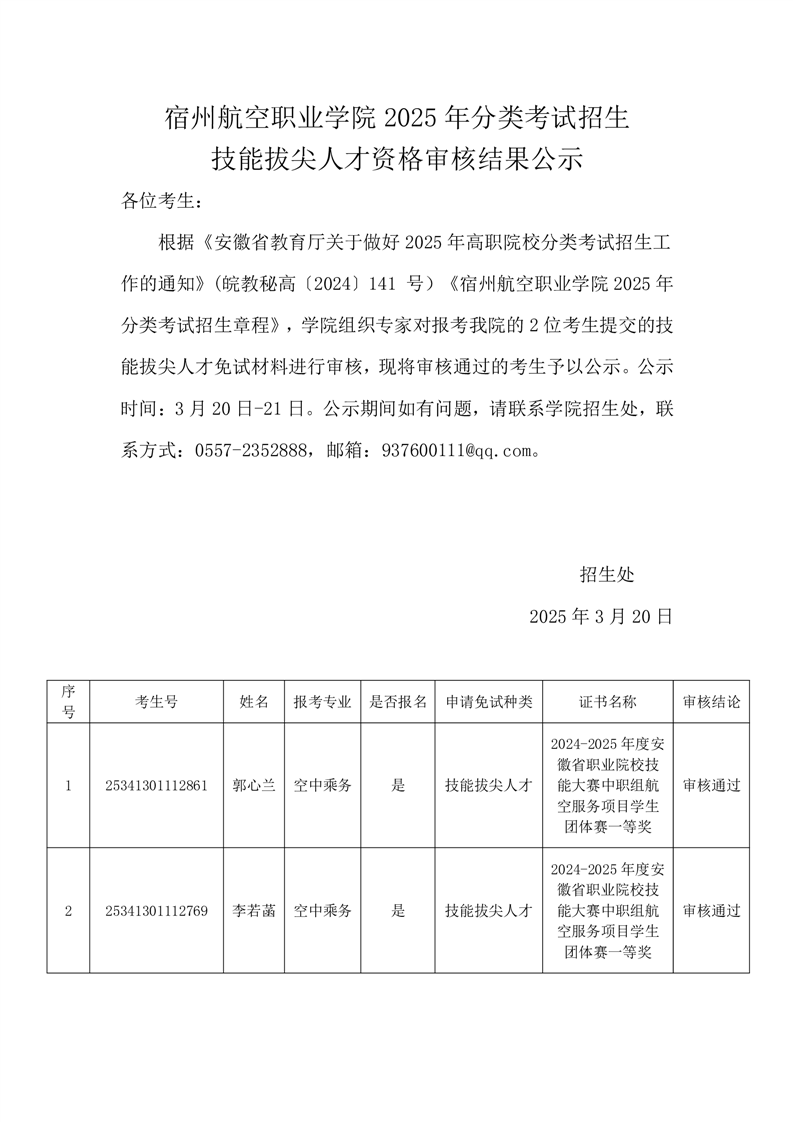 彩神Vll学院 2025 年分类考试招生技能拔尖人才资格审核结果公示