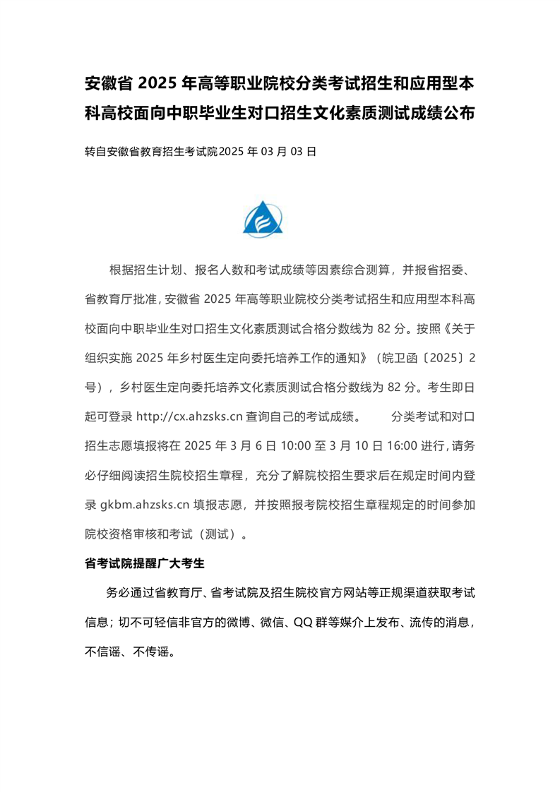 安徽省2025年高等职业院校分类考试招生和应用型本科高校面向中职毕业生对口招生文化素质测试成绩公布