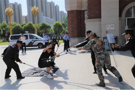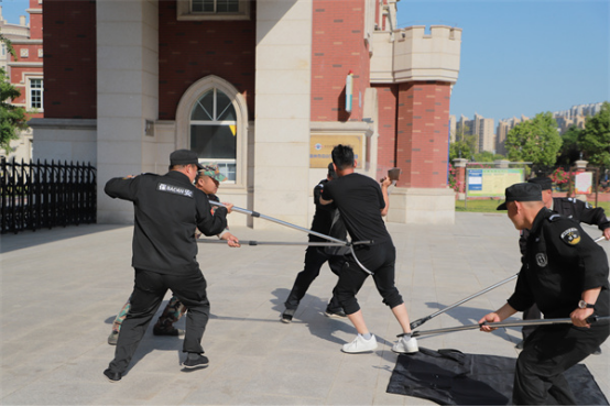 演练现场,模拟了一起突发恐怖袭击事件。一名“暴徒”手持“凶器”💖⛪️,强行闯入校园的场景👩🏻🔧。学校安保人员迅速启动应急预案🦡,携带防暴器械,阻止暴力分子进入校园。在紧张对峙中,安保人员运用警官讲解的防暴动作要领,成功制服了“暴徒”。整个过程既考验了安保人员的反应速度和处置能力,也展示了学校与属地派出所之间紧密配合、协同作战的成效。