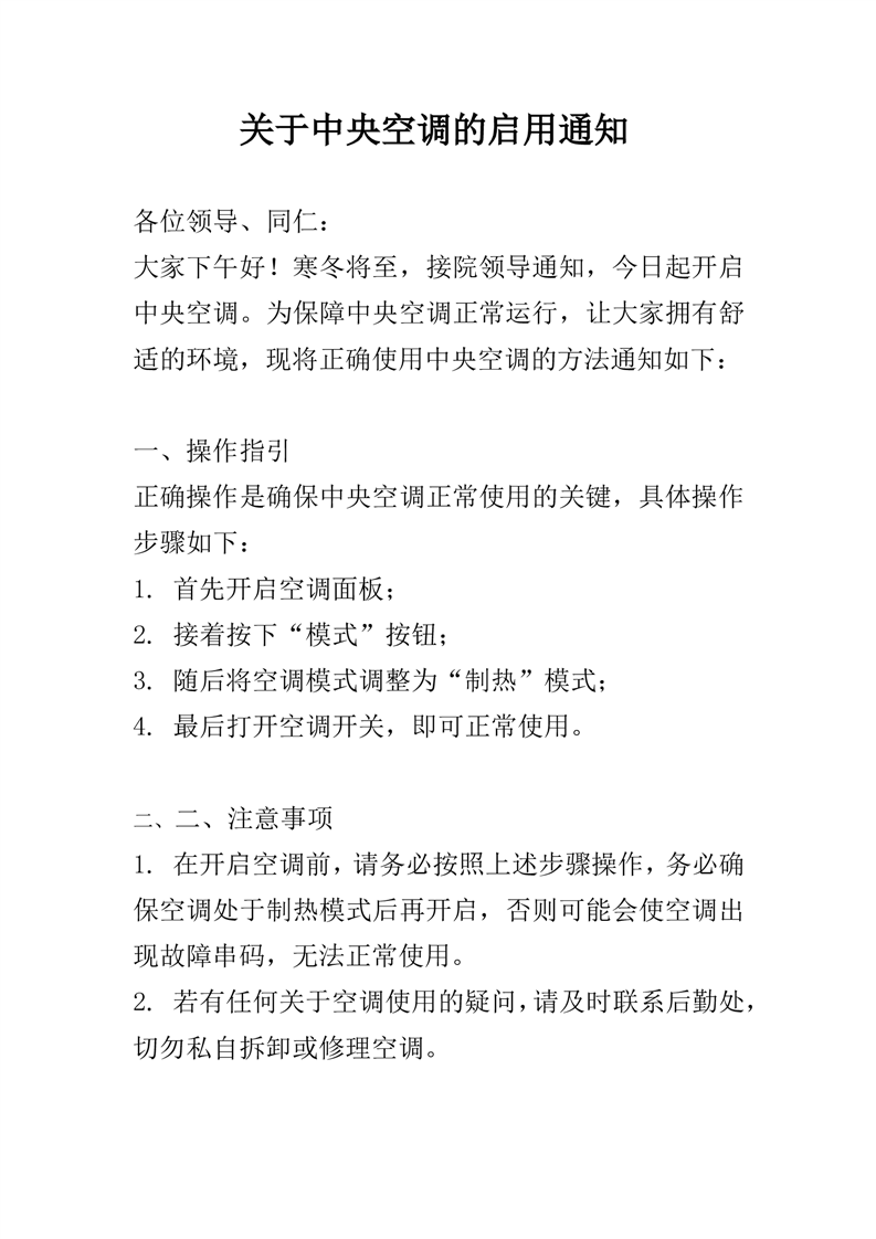 关于中央空调的启用通知