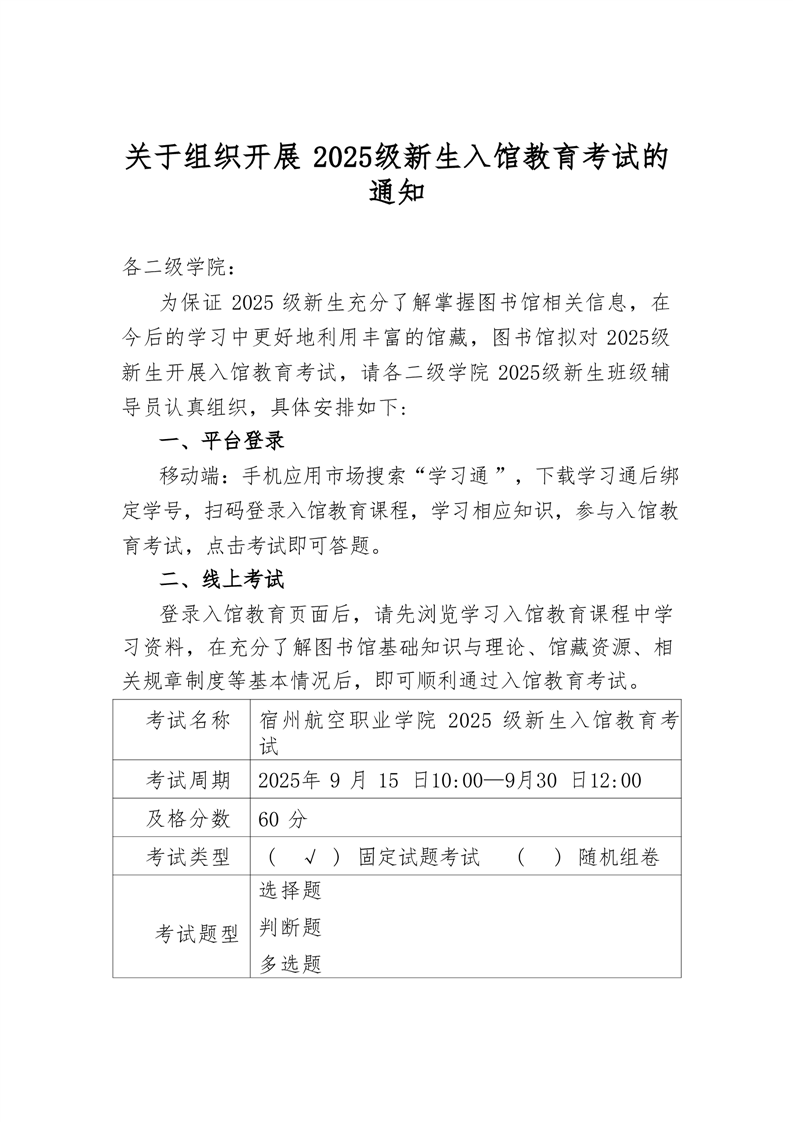 关于组织开展 2025级新生入馆教育考试的 通知