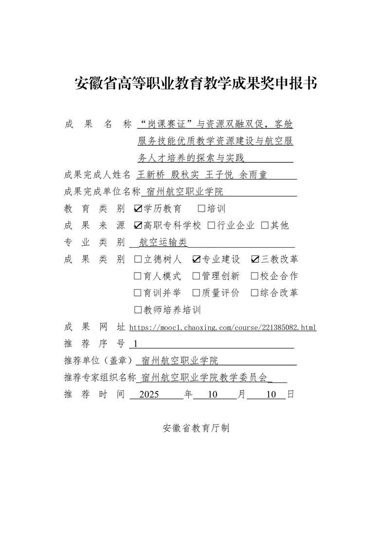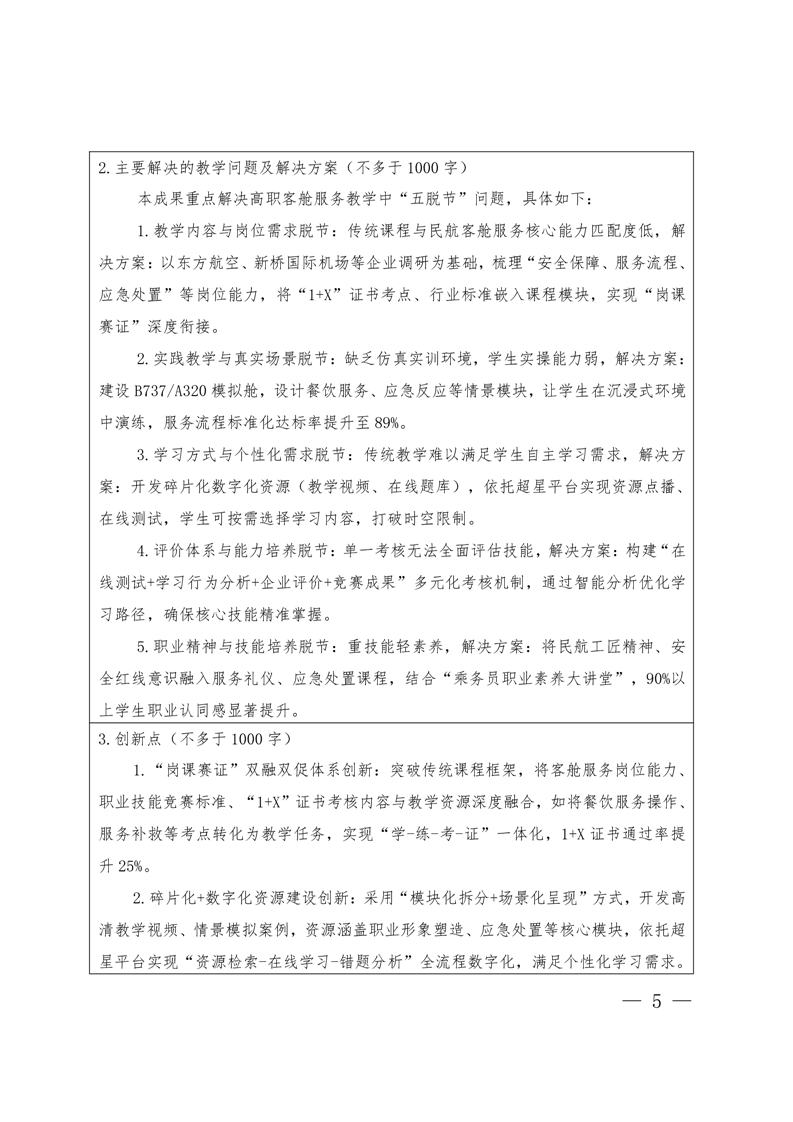 “岗课赛证”与资源双融双促,客舱服务技能优质教学资源建设与航空服务人才培养的探索与实践教学成果申报书