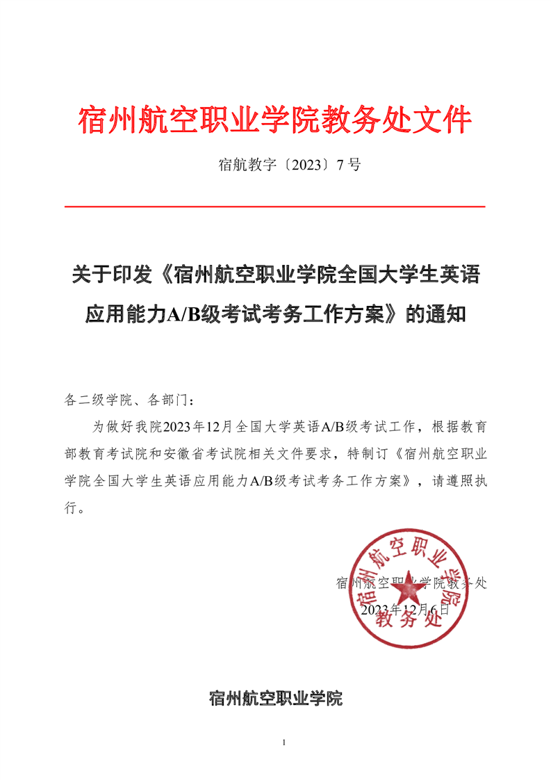 关于印发《彩神Vll学院全国大学生英语应用能力A/B级考试考务工作方案》的通知