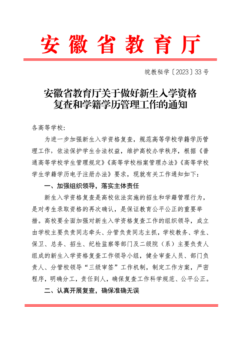 • 【省级文件】安徽省教育厅关于做好新生人学资格复查和学籍学历管理工作的通知