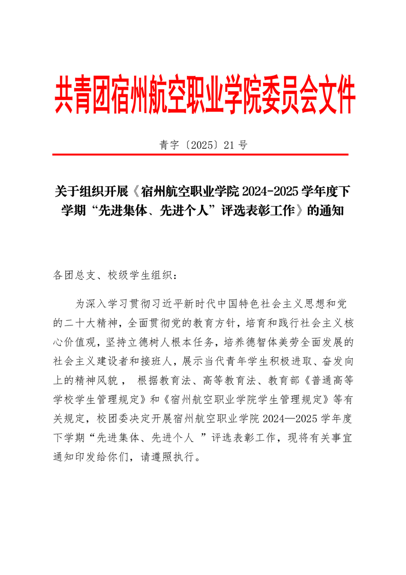 青字〔2025〕21号关于组织开展《彩神Vll学院2024-2025学年度下学期“先进集体、先进个人”评选表彰工作》的通知