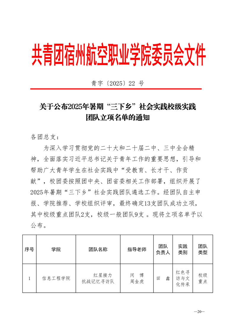 青字〔2025〕22 号关于公布2025年暑期“三下乡”社会实践校级实践团队立项名单的通知