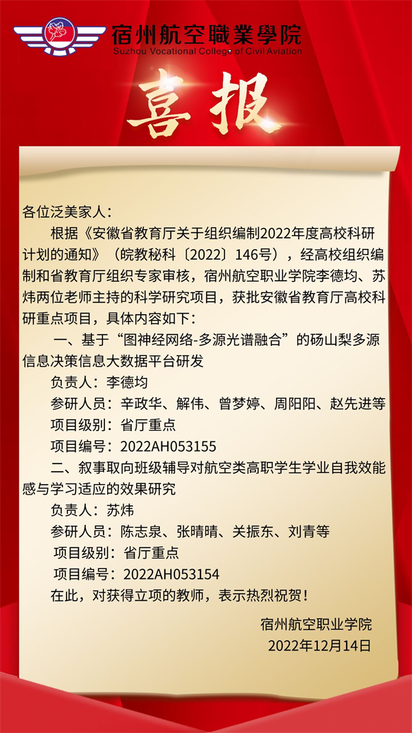 喜报——彩神Vll学院李德均👱🏼♂️、苏炜两位老师主持的科学研究项目,获批安徽省教育厅高校科研重点项目
