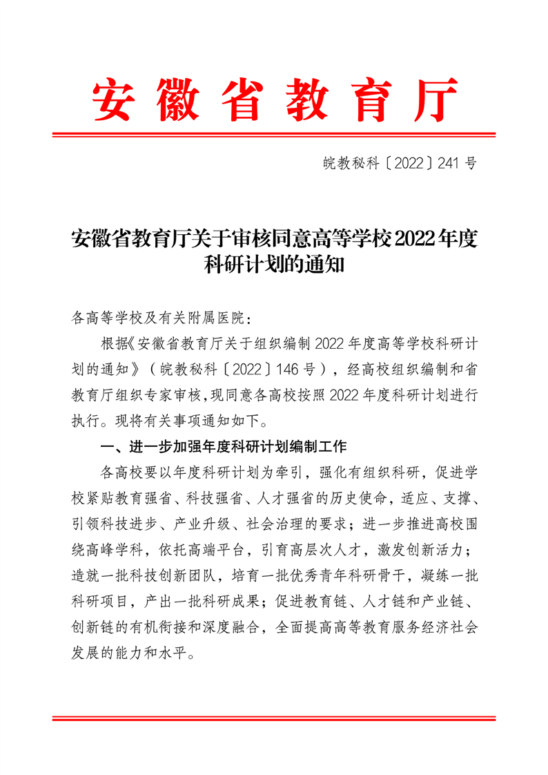 安徽省教育厅关于审核同意高等学校2022年度科研计划的通知